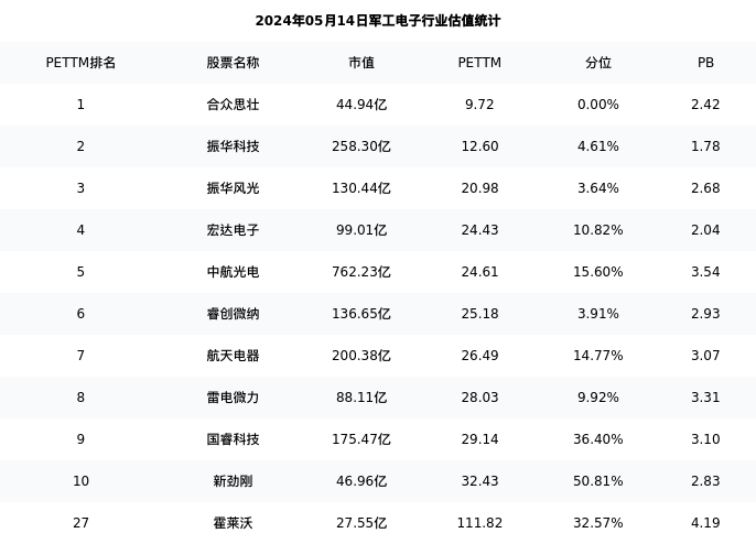 霍莱沃最新报告期数据为一季度,下表汇总了军工电子行业内市值靠前的公司一季度主要经营数据