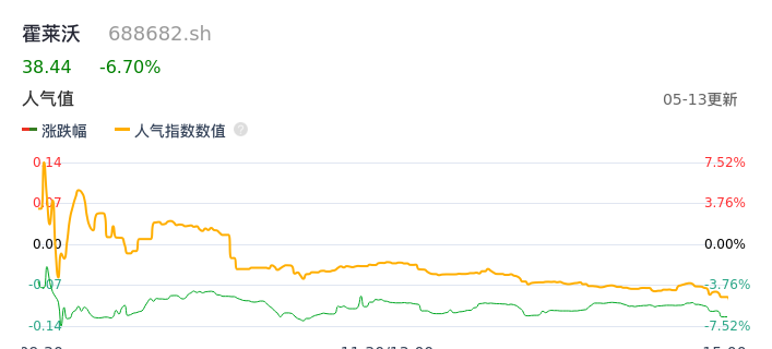 05月13日,霍莱沃收报38.44,股价涨幅-6.70%,成交金额7155.48万元,换手率2.53%。