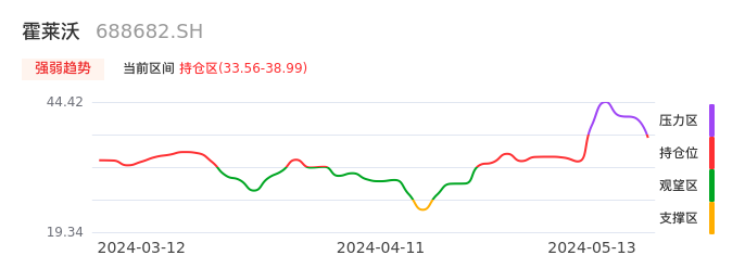 我们来看一下该股的九方特色指标强弱趋势的情况:霍莱沃近日从压力区回到持仓区。股价快速拉升后出现持续调整。后续主要关注下方支撑位:33.56元是否能启稳回升。