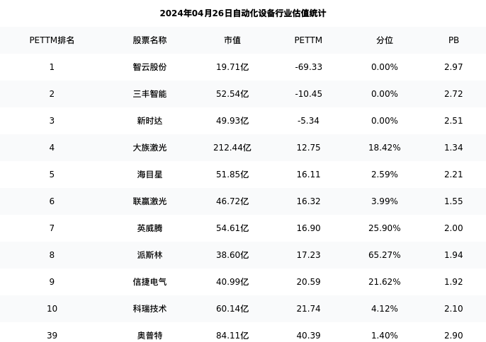 从估值角度看:奥普特最新市盈率PETTM为40.39,在行业内排名36/80,处于1.40分位。