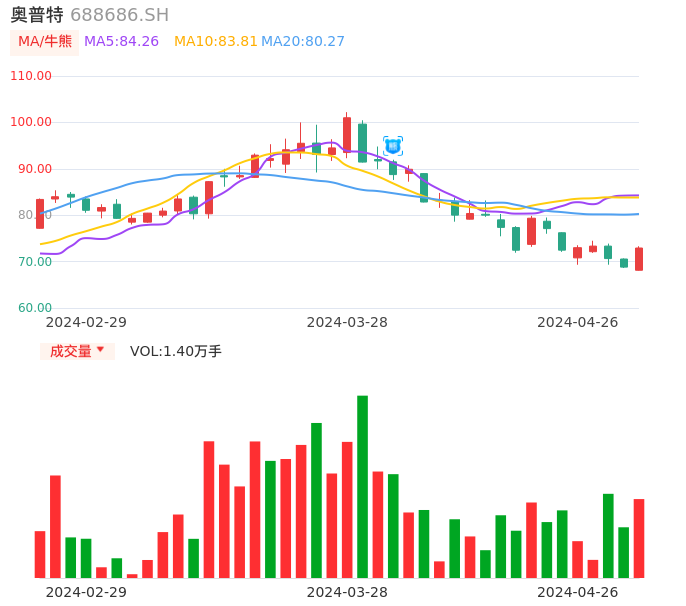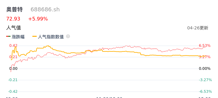 04月26日,奥普特收报72.93,股价涨幅5.99%,成交金额1.00亿元,换手率1.14%。