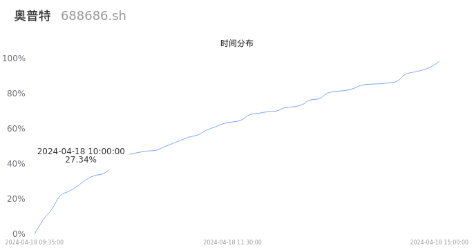 首先我们来看当日成交的时间分布。将今日交易时间按照5分钟的时间间隔进行切片,并绘制分布直方图进行观察。可以发现,10点之前的成交量占全天成交量的27.34%,这说明,该股票活跃时段换手率一般,资金热度较一般。