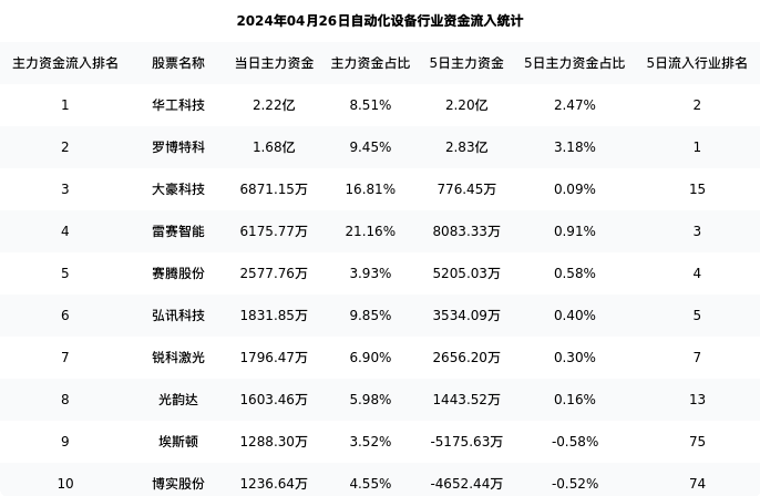 从主力资金流向来看,自动化设备行业今日主力资金流入57.38亿元,在所有申万二级行业中排名:124/131。