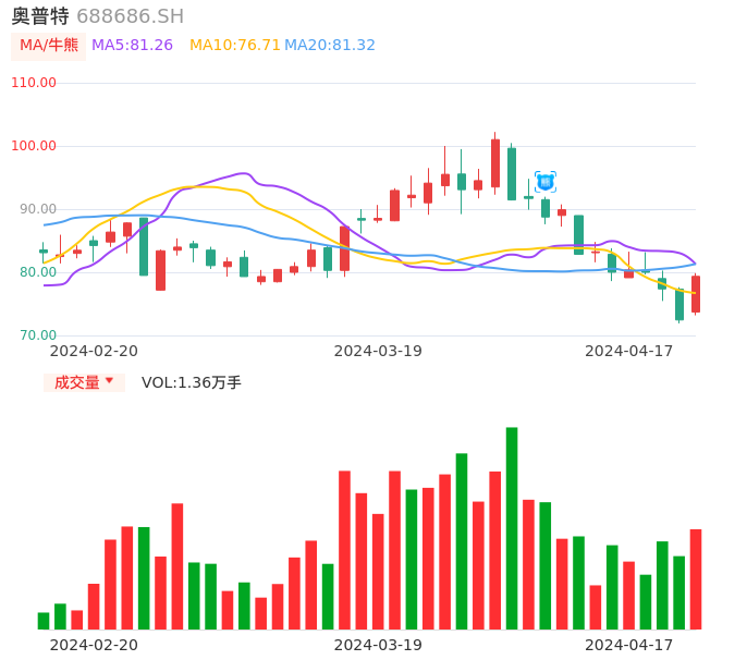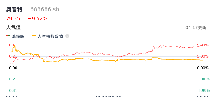04月17日,奥普特收报79.35,股价涨幅9.52%,成交金额1.04亿元,换手率1.11%。