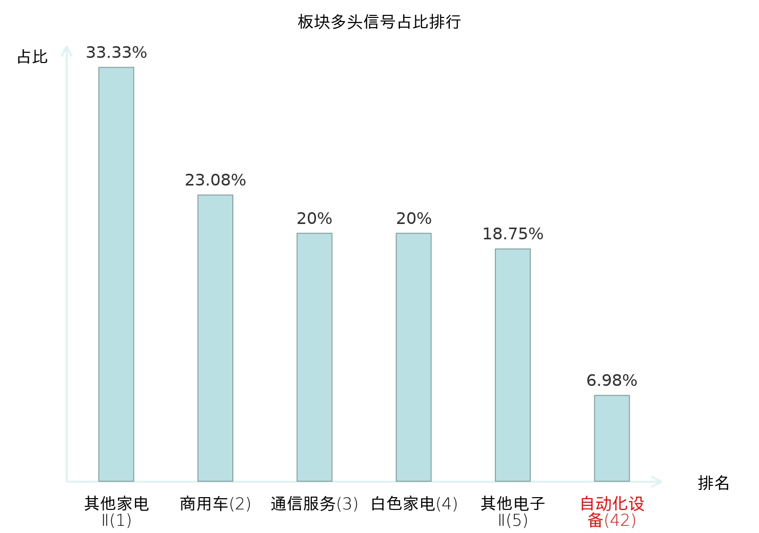 全市场所有行业板块中主力多头信号占比排名中,其他家电Ⅱ板块位居第一。其他家电Ⅱ板块名次提升最快,较昨日上升129位。