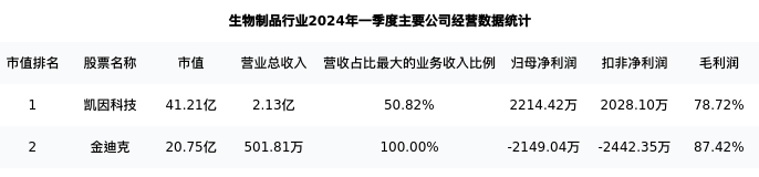 凯因科技最新报告期数据为一季度,下表汇总了生物制品行业内市值靠前的公司一季度主要经营数据