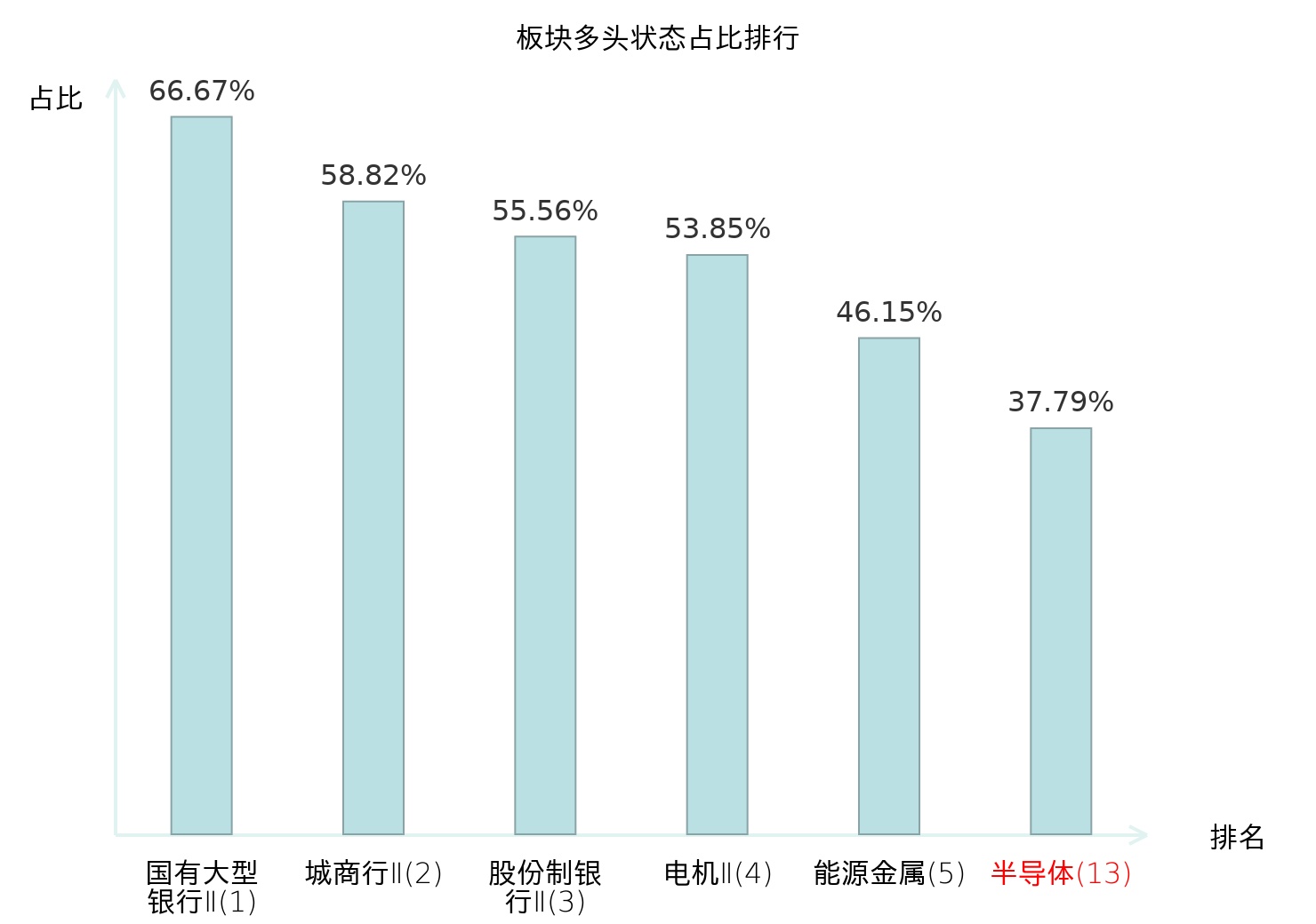 全市场所有行业板块中主力多头状态占比排名中,国有大型银行Ⅱ板块位居第一。自动化设备板块名次提升最快,较昨日上升57位。
