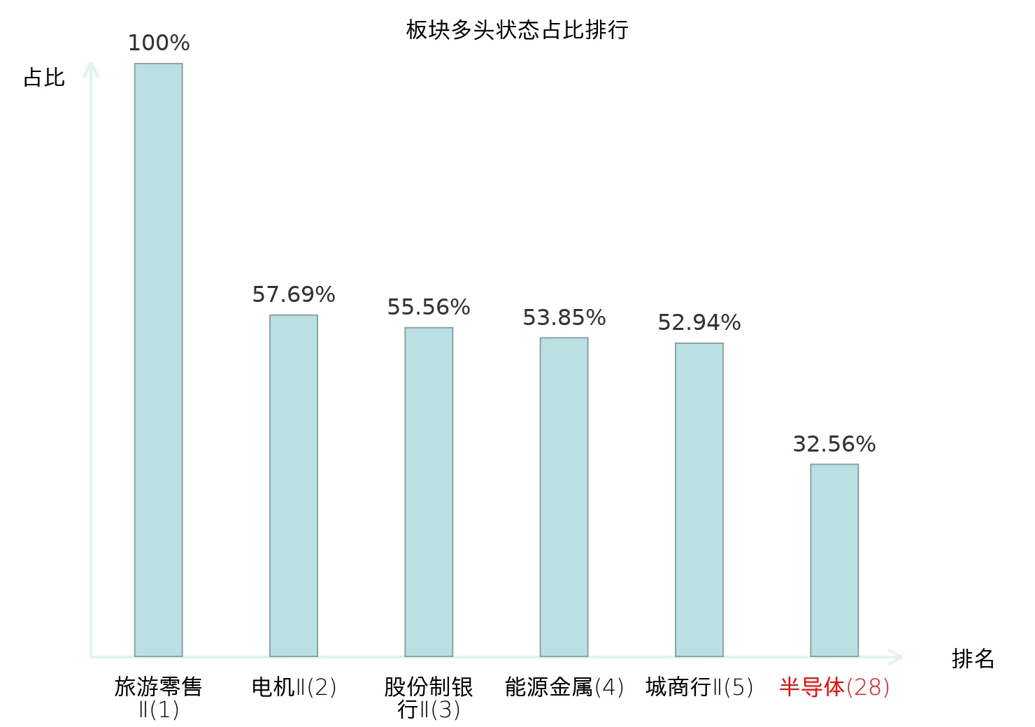 全市场所有行业板块中主力多头状态占比排名中,旅游零售Ⅱ板块位居第一。地面兵装Ⅱ板块名次提升最快,较昨日上升99位。