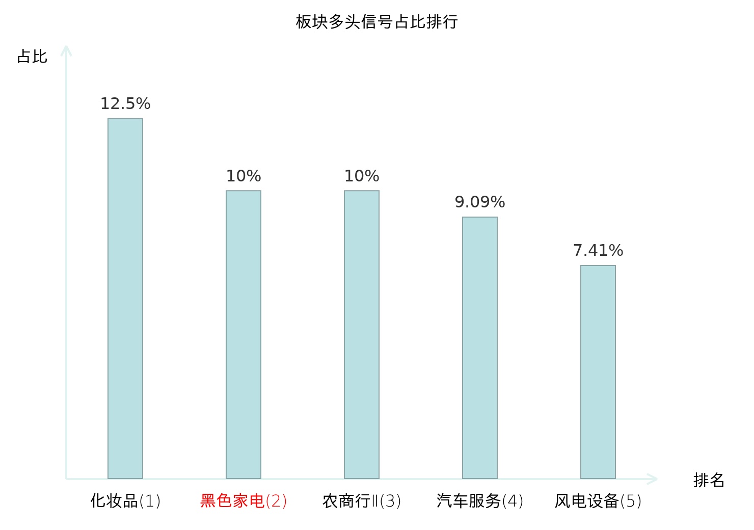 全市场所有行业板块中主力多头信号占比排名中,化妆品板块位居第一。黑色家电板块名次提升最快,较昨日上升111位。