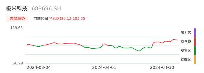 我们来看一下该股的九方特色指标强弱趋势的情况:极米科技自04月22日从观望区上穿到持仓区。股价近期在多头区域持续强势上扬,上升动能仍较为充足,可积极关注。后续重点关注上方压力位:103.55元是否能突破上攻。