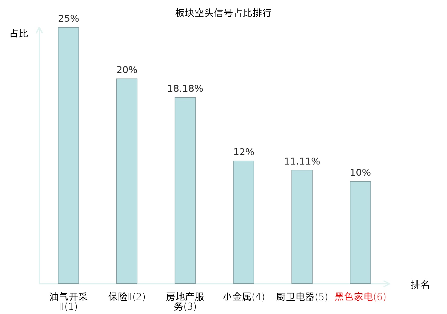 全市场所有行业板块中主力空头信号占比排名中,油气开采Ⅱ板块位居第一。装修建材板块名次提升最快,较昨日上升117位。