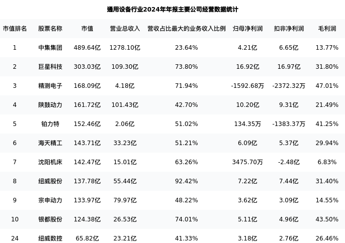 纽威数控最新报告期数据为年报,下表汇总了通用设备行业内市值靠前的公司年报主要经营数据