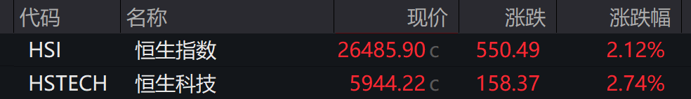 港股:截止发稿,恒生指数涨至2.12%,恒生科技指数涨2.74%。