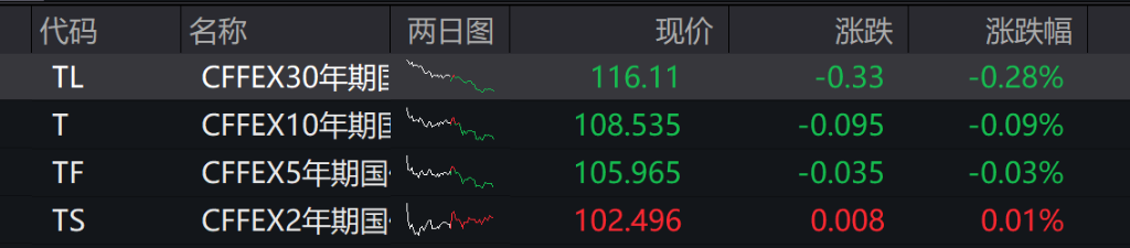 债市普跌,30年期主力合约跌0.28%,10年期主力合约跌0.09%,5年期主力合约跌0.03%,2年期主力合约涨0.05%。