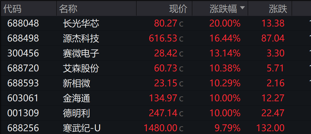 长光华芯20CM涨停,源杰股份涨超16%,仕佳光子涨超12%,寒武纪、腾景科技涨超9%。