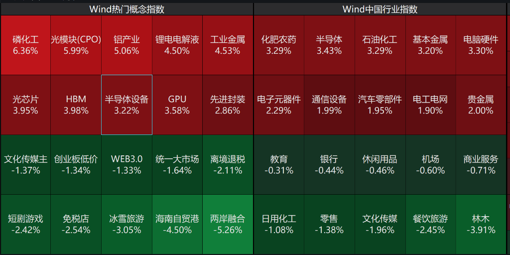 盘面上,沪深京三市全天成交额20759亿元,较上日放量1816亿元。全市场超3800只个股上涨。板块方面,有色板块集体拉升,中国铝业涨停创15年新高,机器人概念股活跃,方正电机等涨停,CPO等算力硬件股走高,汇绿生态等涨停。磷化工板块走强,清水源等涨停。下跌方面,海南板块调整,海汽集团接近跌停。