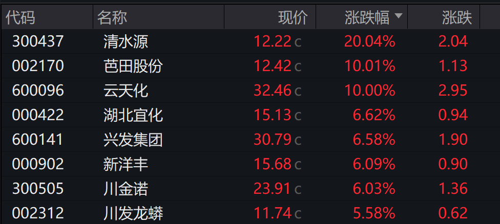 清水源20cm涨停,芭田股份、澄星股份、云天化录得10%涨停。六国化工、安纳达、湖北宜化、兴发集团等个股跟涨。