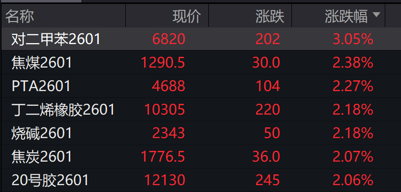 商品多数收涨,焦煤涨2.38%,BR烯橡胶涨2.18%,集运指数(欧线)跌3.91%,跌幅居前。核心市场走势: