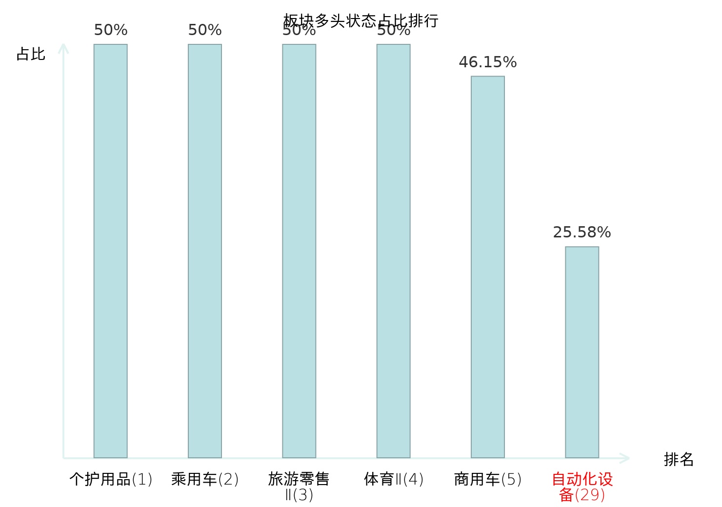 全市场所有行业板块中主力多头状态占比排名中,个护用品板块位居第一。林业Ⅱ板块名次提升最快,较昨日上升94位。