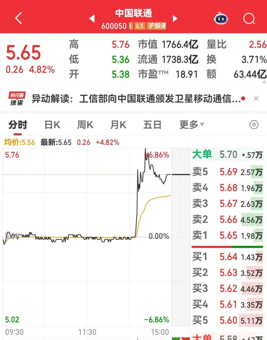 除中国联通外,多只与卫星通信相关的概念股午后拉升明显。中国卫星在14:09左右直线拉升,收盘时股价涨停;震有科技由涨幅不到3%,拉升至12%以上,收盘涨幅10.08%。大幅拉升的还有华力创通、天银机电、北斗星通、航天智装、上海瀚讯等。