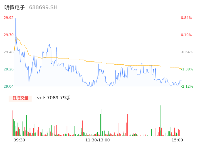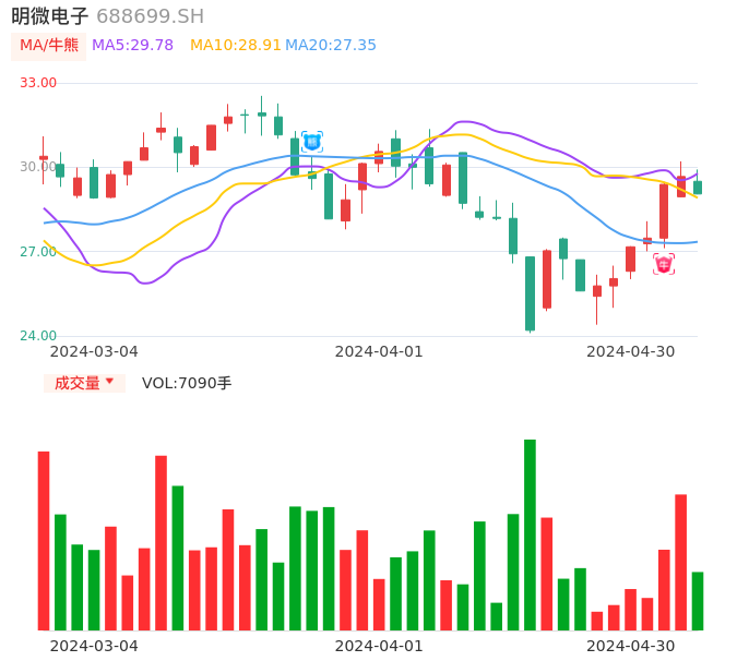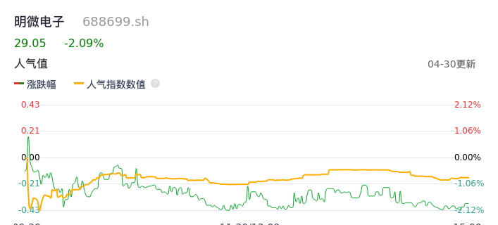 04月30日,明微电子收报29.05,股价涨幅-2.09%,成交金额2074.99万元,换手率0.64%。