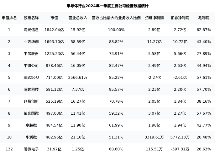 明微电子最新报告期数据为一季度,下表汇总了半导体行业内市值靠前的公司一季度主要经营数据