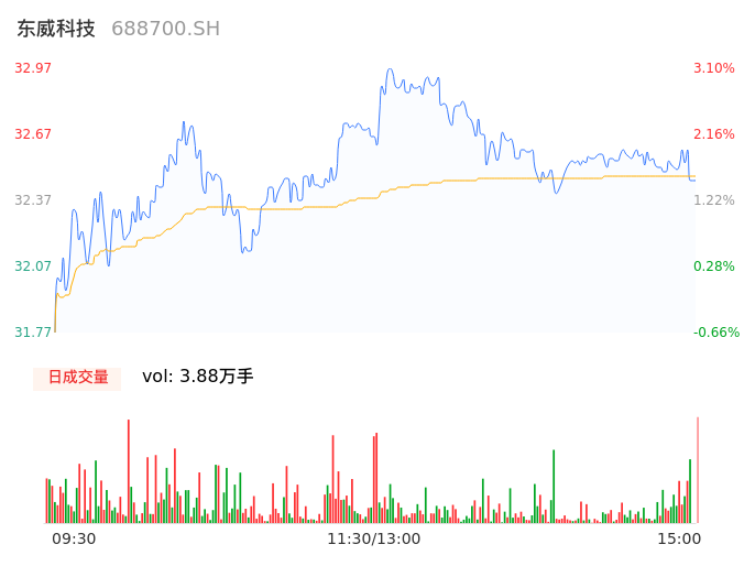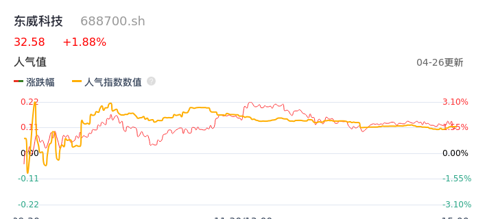 04月26日,东威科技收报32.58,股价涨幅1.88%,成交金额1.26亿元,换手率2.65%。