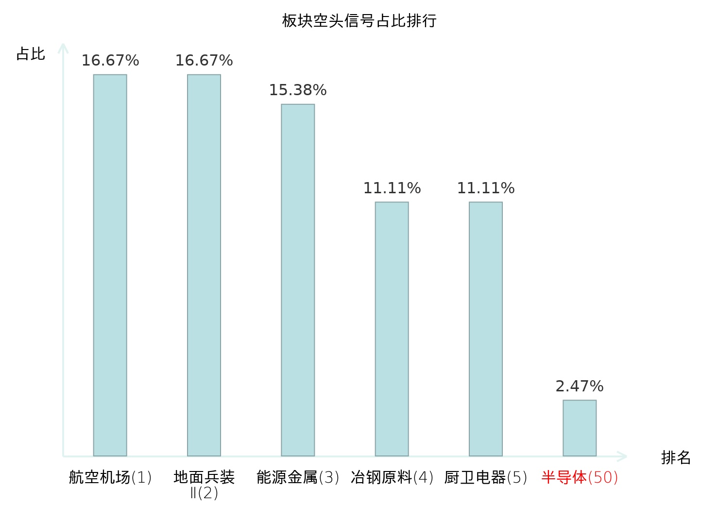 全市场所有行业板块中主力空头信号占比排名中,航空机场板块位居第一。家电零部件Ⅱ板块名次提升最快,较昨日上升110位。