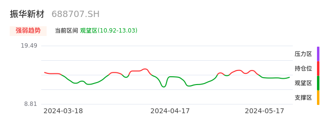 我们来看一下该股的九方特色指标强弱趋势的情况:振华新材自05月13日从持仓区下穿到观望区。股价近期持续下跌后,短期出现止跌迹象。后续重点关注能否再次站上多空分界点:13.03元。如未能有效突破则可能进入新一轮空头行情。