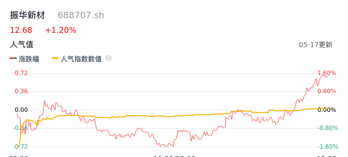 05月17日,振华新材收报12.68,股价涨幅1.20%,成交金额5297.11万元,换手率1.50%。