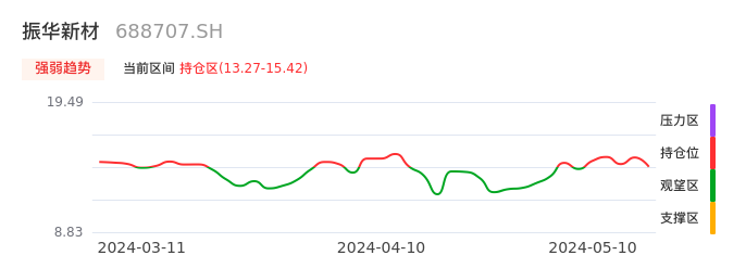 我们来看一下该股的九方特色指标强弱趋势的情况:振华新材自05月06日从观望区上穿到持仓区。股价近期在多头区域回调整理。后续重点关注多空分界点的争夺:13.27元。如未能有效站稳则可能重新回到空头行情。