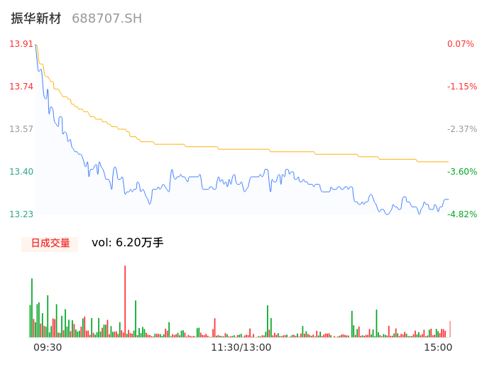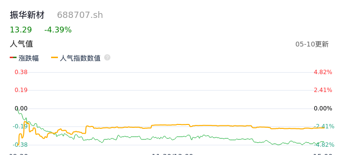 05月10日,振华新材收报13.29,股价涨幅-4.39%,成交金额8333.00万元,换手率2.19%。