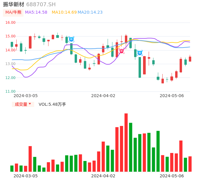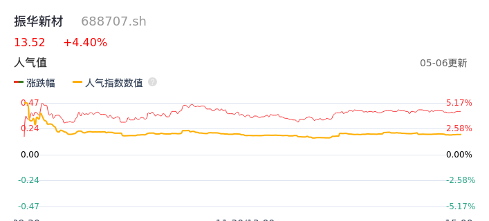 05月06日,振华新材收报13.52,股价涨幅4.40%,成交金额7378.77万元,换手率1.93%。