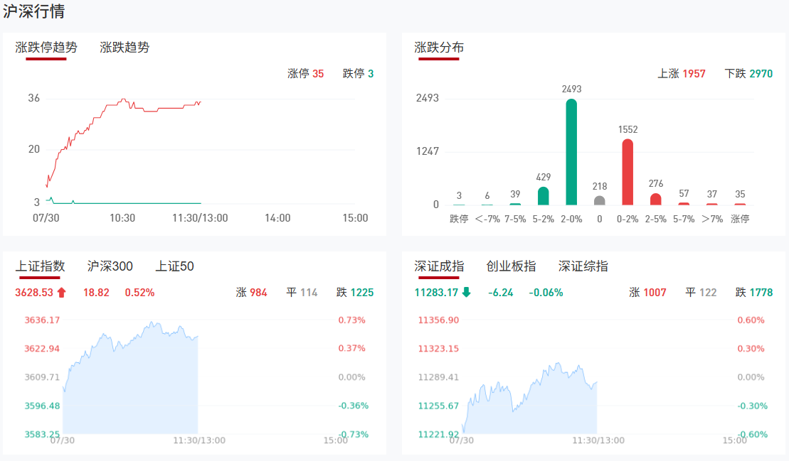 市场早盘震荡分化,三大指数涨跌不一,沪指盘中再创年内新高。沪深两市半日成交额1.09万亿,较上个交易日缩量432亿。盘面上热点较为杂乱,个股跌多涨少,全市场超3100只个股下跌。从板块来看,医药股持续活跃,辰欣药业等多股涨停。影视股再度走强,幸福蓝海20CM3连板。超级水电概念股一度冲高,西宁特钢7天6板。下跌方面,稳定币概念股展开调整,东信和平等多股跌超5%。