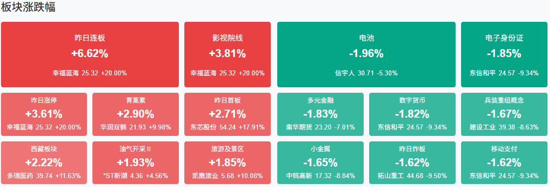 板块方面,影视、油气、创新药、钢铁等板块涨幅居前,稀土永磁、固态电池、稳定币、人形机器人等板块跌幅居前。截至收盘,沪指涨0.08%,深成指跌0.06%,创业板指涨0.71%。