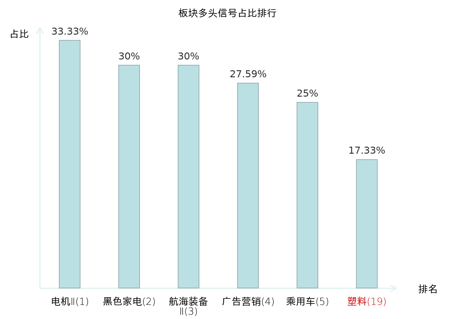 从主力宝信号数据分析,中研股份所属的塑料板块中共有13只股票发出主力多头信号,主力多头信号占比在全行业中排名第19位,较昨日上升1位。排名升高表明主力当日买入意愿增强。全市场所有行业板块中主力多头信号占比排名中,电机Ⅱ板块位居第一;乘用车板块名次提升最快,较昨日上升114位。这些变动揭示了不同行业间主力资金偏好的变化,为投资者观察市场趋势提供了重要依据。