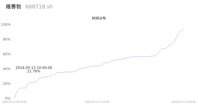 688718唯赛勃2024年05月13日成交8366手,成交金额897.75万元,相较昨日放量2799手,换手率1.48%,成交清淡。
