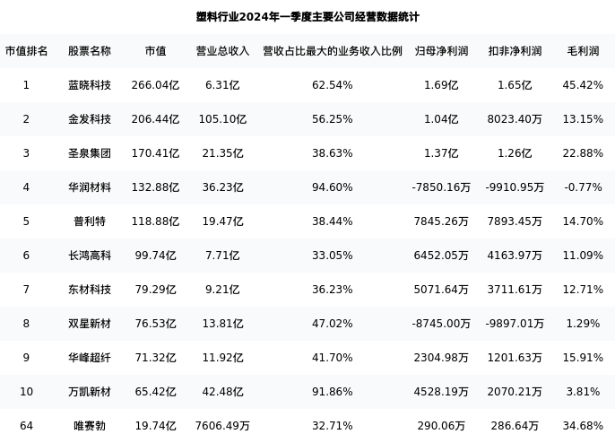 唯赛勃最新报告期数据为一季度,下表汇总了塑料行业内市值靠前的公司一季度主要经营数据