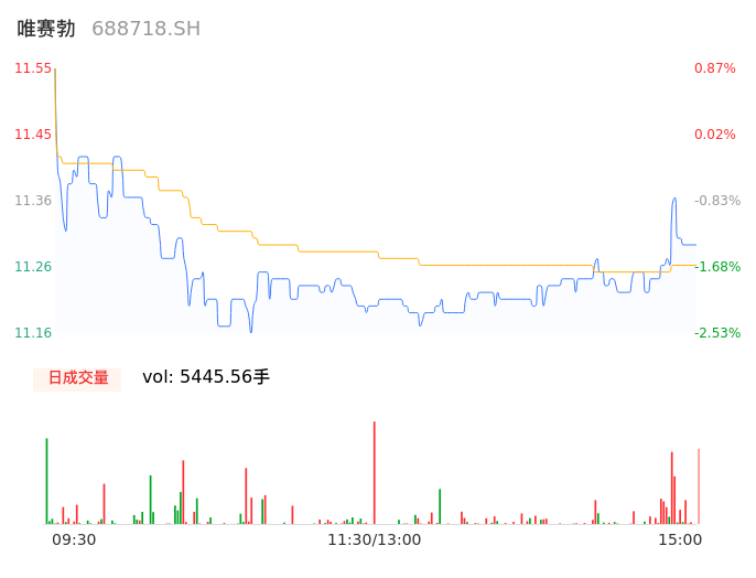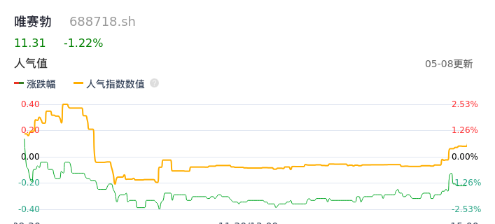 05月08日,唯赛勃收报11.31,股价涨幅-1.22%,成交金额613.36万元,换手率0.96%。