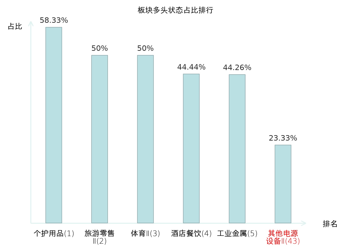 全市场所有行业板块中主力多头状态占比排名中,个护用品板块位居第一。非白酒板块名次提升最快,较昨日上升65位。