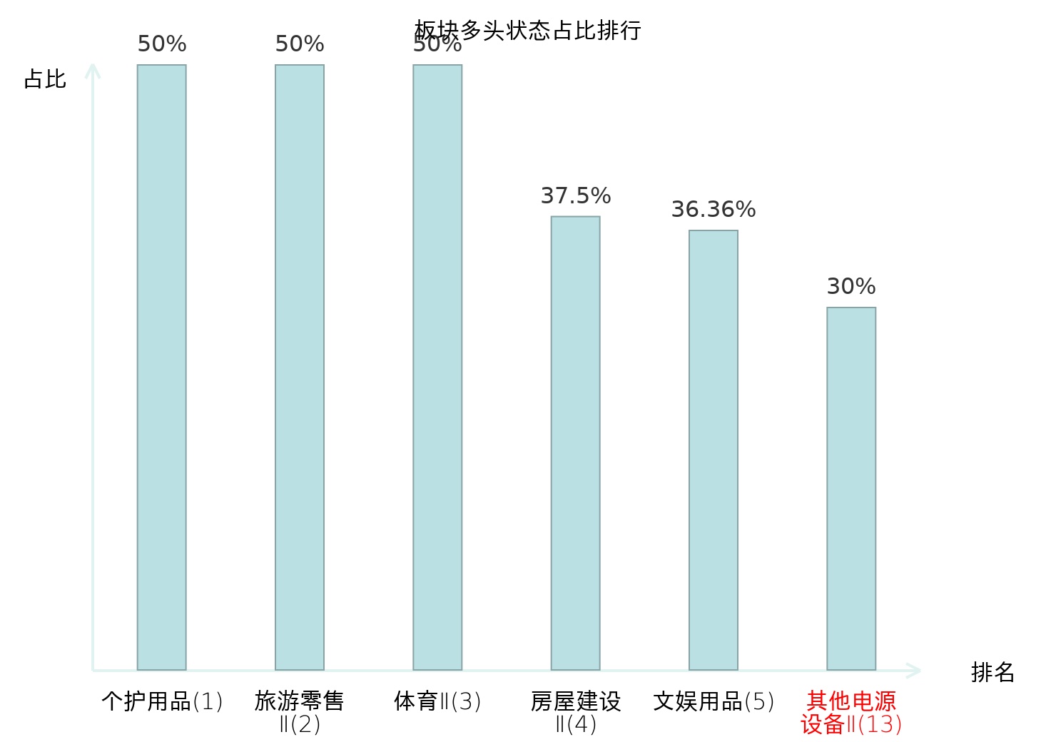 全市场所有行业板块中主力多头状态占比排名中,个护用品板块位居第一。焦炭Ⅱ板块名次提升最快,较昨日上升68位。