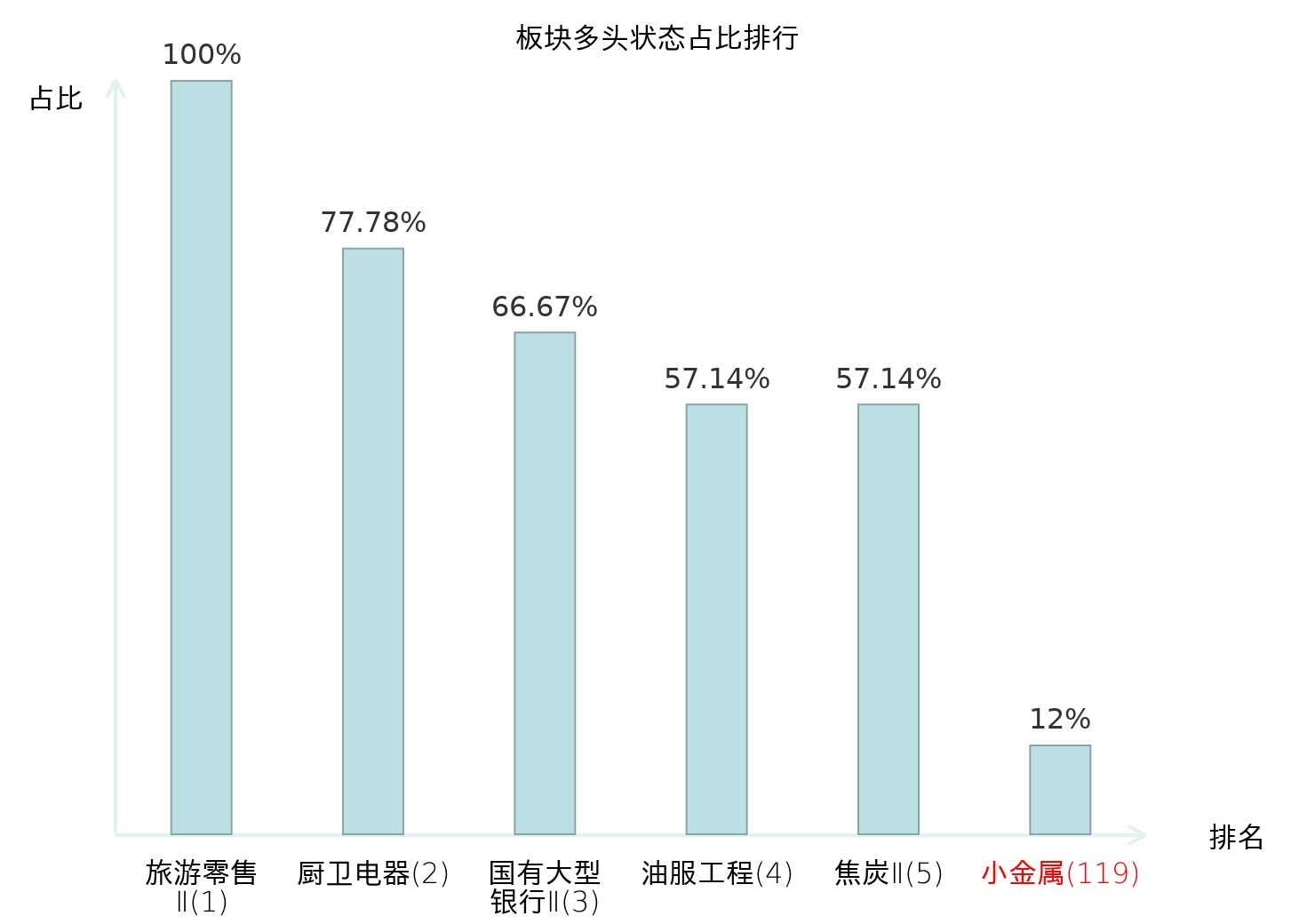 全市场所有行业板块中主力多头状态占比排名中,旅游零售Ⅱ板块位居第一。房地产服务板块名次提升最快,较昨日上升71位。