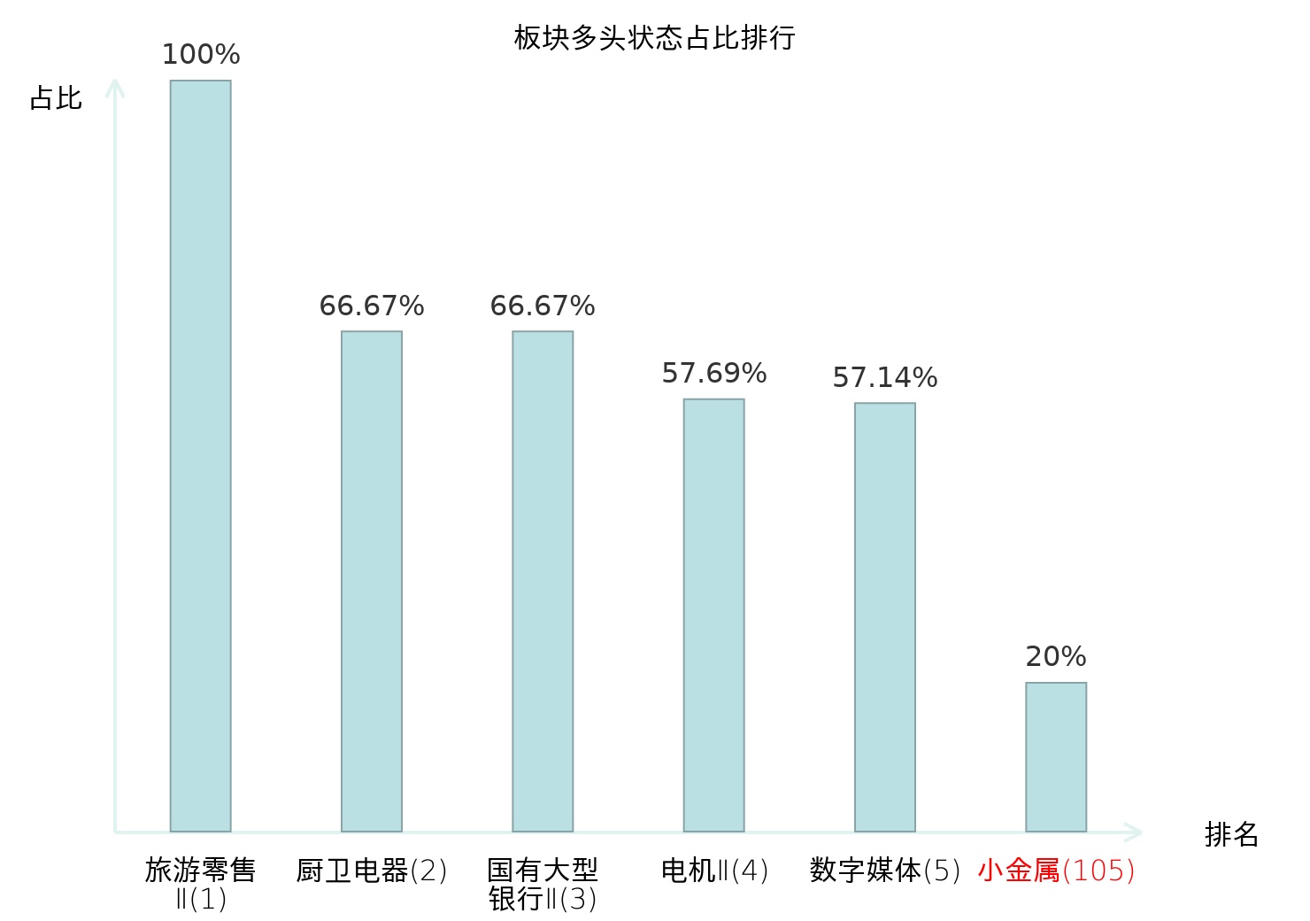 全市场所有行业板块中主力多头状态占比排名中,旅游零售Ⅱ板块位居第一。汽车服务板块名次提升最快,较昨日上升70位。