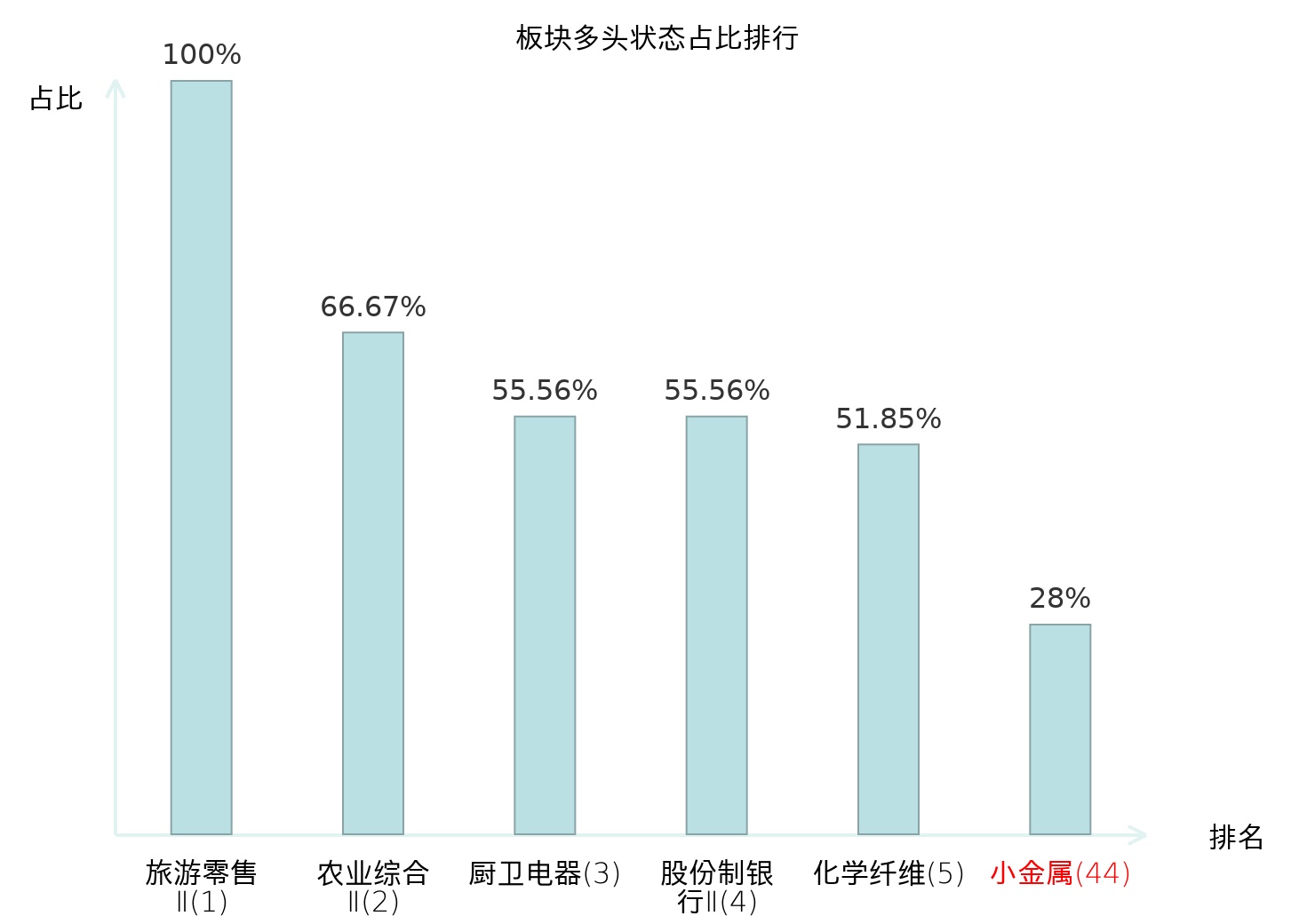 全市场所有行业板块中主力多头状态占比排名中,旅游零售Ⅱ板块位居第一。国有大型银行Ⅱ板块名次提升最快,较昨日上升103位。