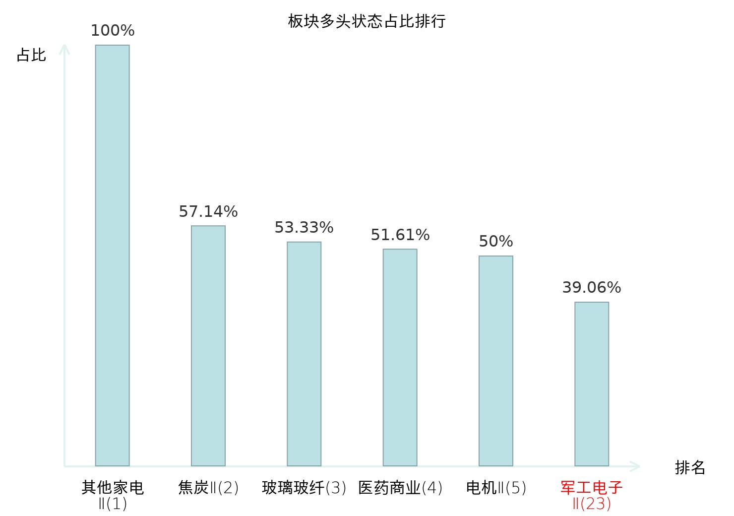 全市场所有行业板块中主力多头状态占比排名中,其他家电Ⅱ板块位居第一。白色家电板块名次提升最快,较昨日上升67位。