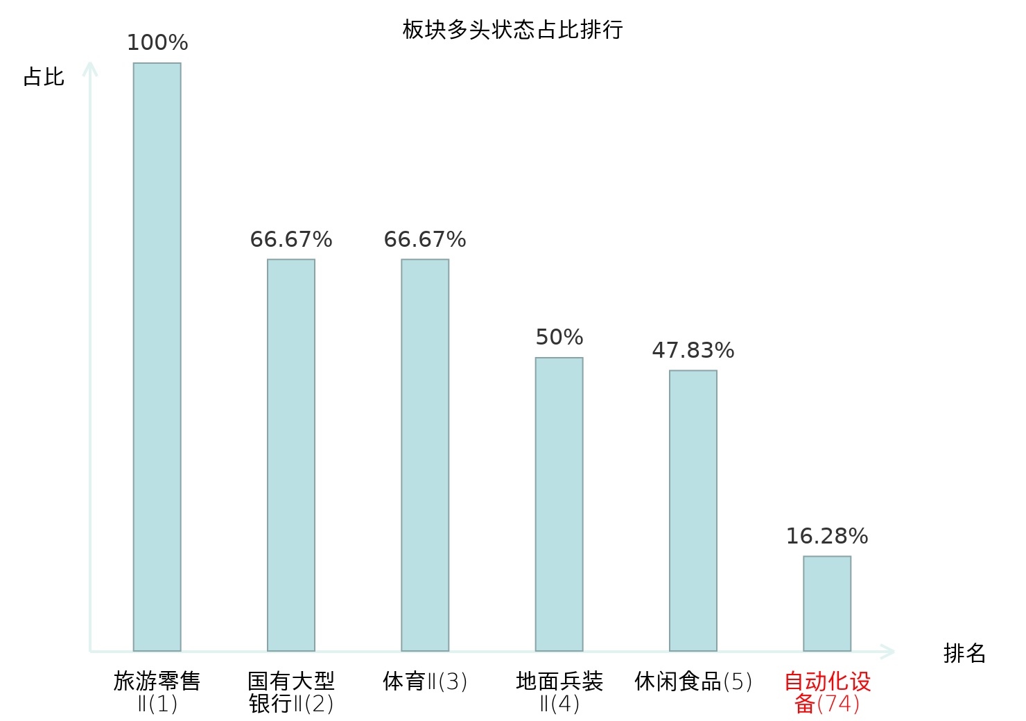 全市场所有行业板块中主力多头状态占比排名中,旅游零售Ⅱ板块位居第一。航空机场板块名次提升最快,较昨日上升80位。
