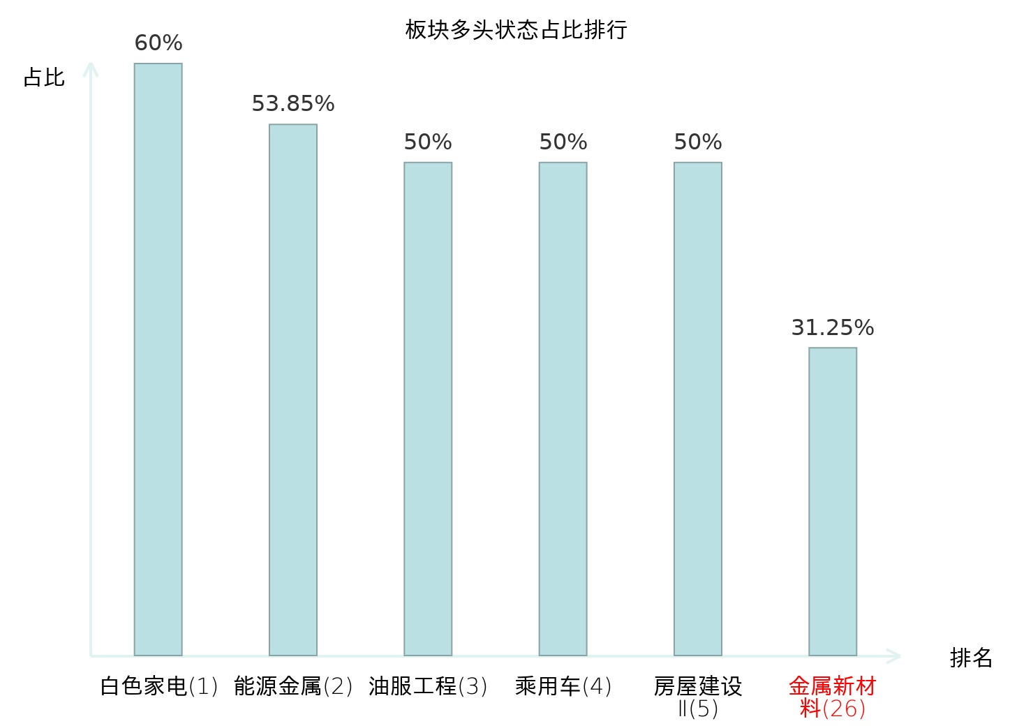 全市场所有行业板块中主力多头状态占比排名中,白色家电板块位居第一。油气开采Ⅱ板块名次提升最快,较昨日上升45位。