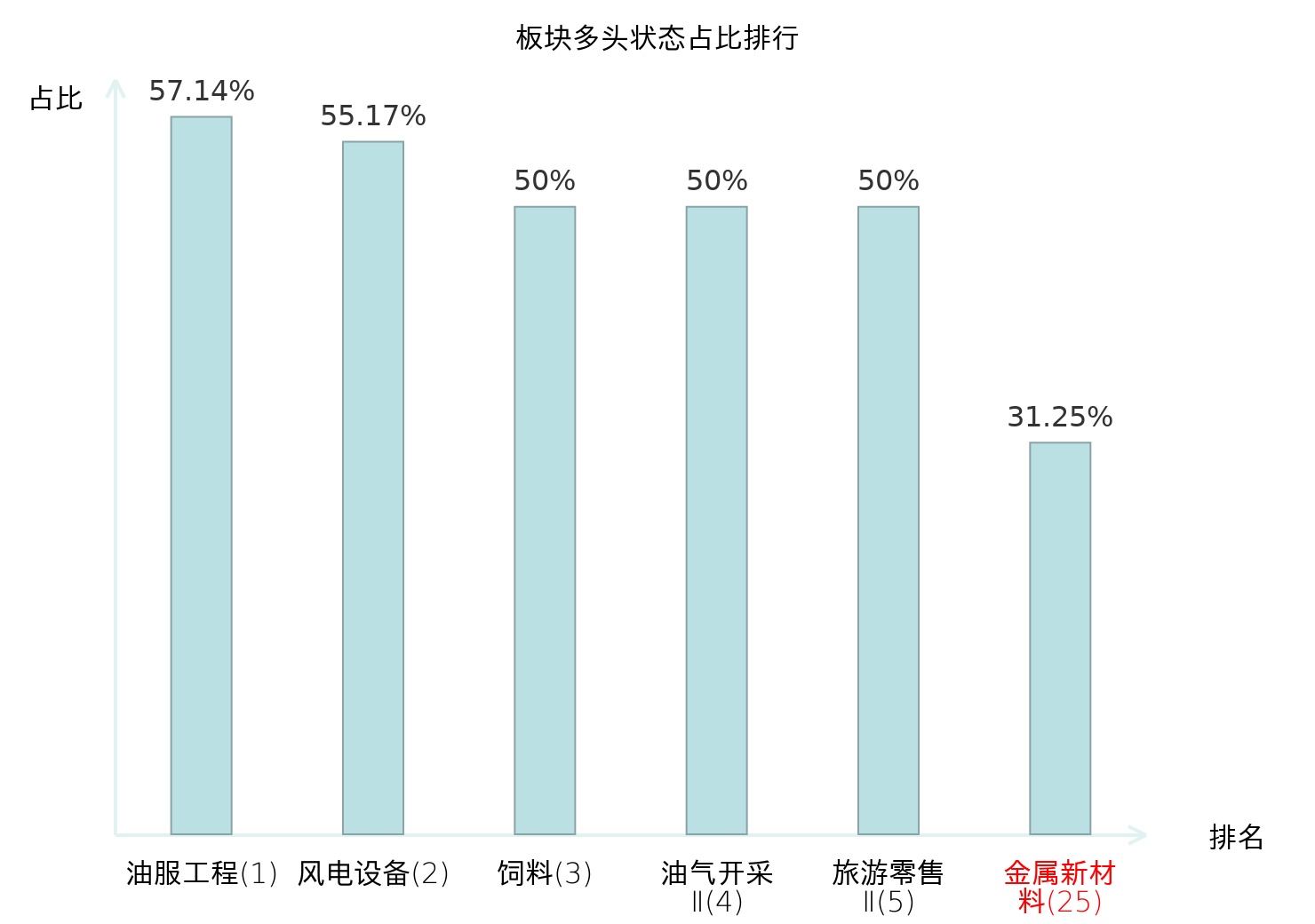 全市场所有行业板块中主力多头状态占比排名中,油服工程板块位居第一。非金属材料Ⅱ板块名次提升最快,较昨日上升67位。