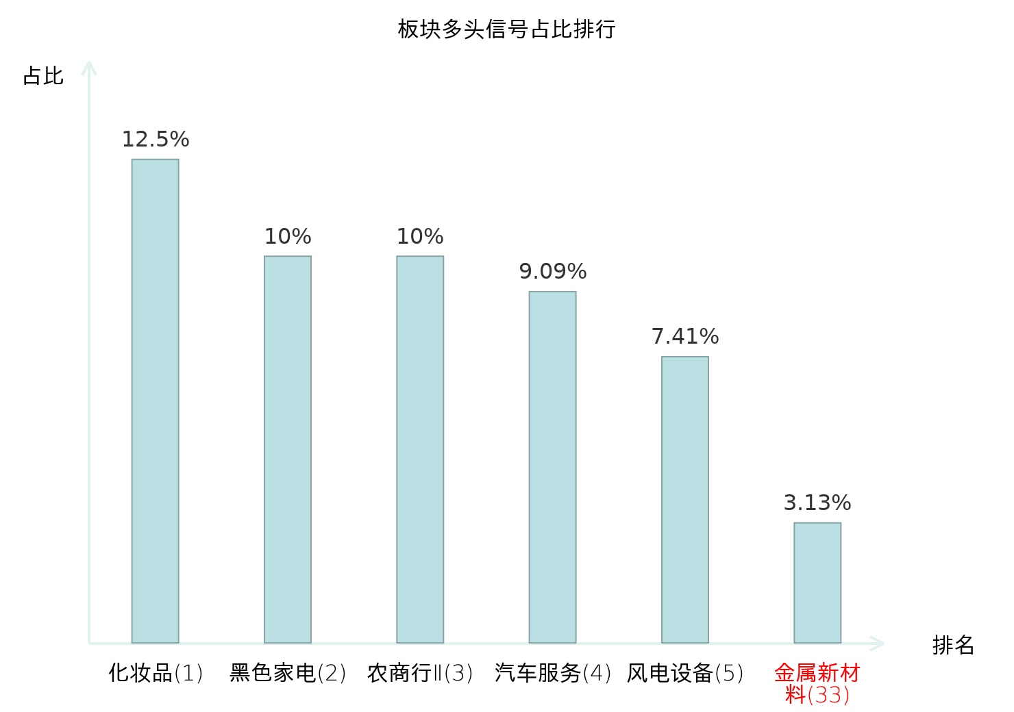 全市场所有行业板块中主力多头信号占比排名中,化妆品板块位居第一。黑色家电板块名次提升最快,较昨日上升111位。