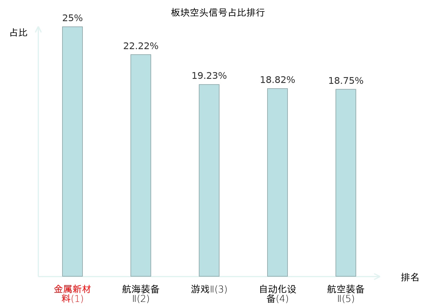 全市场所有行业板块中主力空头信号占比排名中,金属新材料板块位居第一。证券Ⅱ板块名次提升最快,较昨日上升120位。